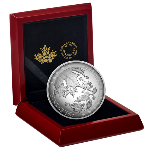 The convex reverse features a swirling cluster of maple leaves, designed by Canadian artist Lisa Thomson-Khan. Together, the unique shape, dynamic design, and mirror-like sheen of the proof finish lend this stunning image a three-dimensional quality that makes it feel as though you're holding a whirlwind in the palm of your hand. The reverse features the date "2017", the word "CANADA", and the face value of "50 DOLLARS".