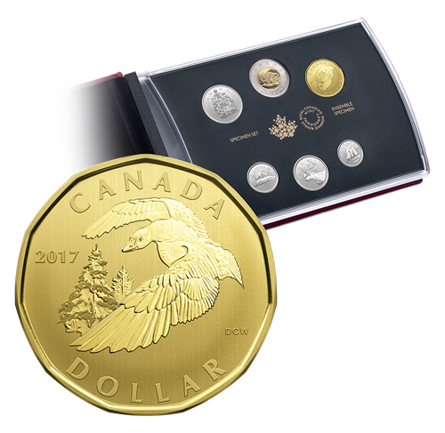 The year 2017 marks the 150th anniversary of Canadian Confederation. To honour this historic occasion, the Royal Canadian Mint's 2017 specimen set pays tribute to a Canadian icon with a one-dollar coin featuring the beloved snow goose in a dramatic pose, preparing to land on a quiet northern lake.