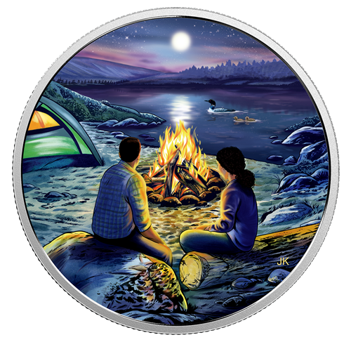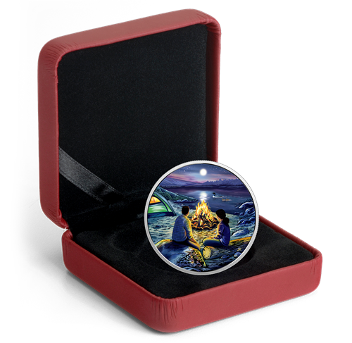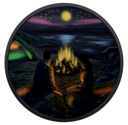 Designed by Joel Kimmel, your coin captures the mood in an idyllic lakeside setting, where two campers are enjoying a fireside moment. Blue and purple colours dominate the landscape, where the shadowy shapes of rolling hills and dense forest rise up along thehorizon. In the sky, pink hues are the last, lingering reminders of daylight, as a canopy of stars emerges overhead. Glow-in-the-dark technology re-creates the luminous shine of a full moon and its reflection on the lake, where a loon and two chicks are still visible in the moonlight. On the sandy beach, the male camper rests on a rock while the female sitson a log; both are quietly enjoying each other's company while taking in the beauty of their surroundings. Their profiles are softly illuminated by the warm glow of the campfire "burning" bright at the centre of the coin, not far from the pitched tent that is illuminated from within. The obverse features the effigy of Her Majesty Queen Elizabeth II by Susanna Blunt.