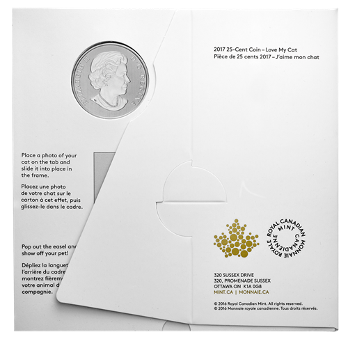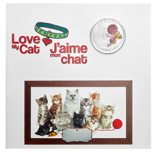 Your coin's design combines engraved and coloured elements in a loving tribute to the pet cats that play a large role in the lives of so many Canadians. On the left is the raised and engraved silhouette ofcat in a seated position, its tail wrapped around itself as it faces right.