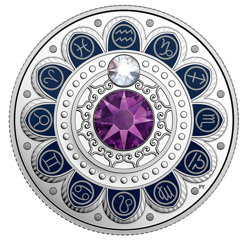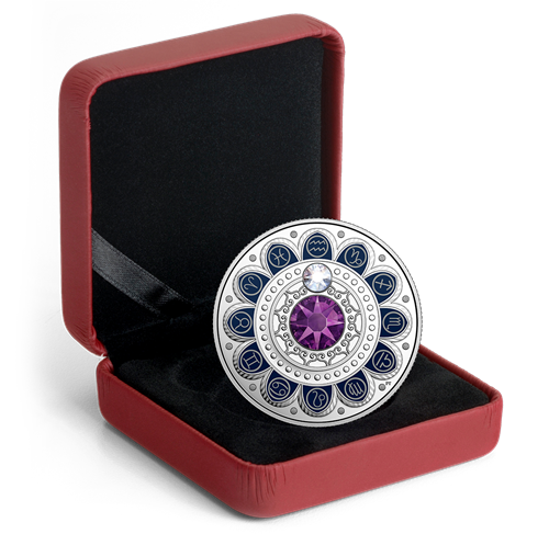 Designed by Pandora Young, your coin features an eye-catching combination of colour and engraving that results in a beautifully artistic rendition of the zodiac. Like the stars and planets in the sky, a clear Swarovski crystal embellishment is in alignment with the traditional glyph of two waves, which is the zodiac symbol for Aquarius (January 21–February 19). At the centre is a larger Swarovski crystal embellishment; its violet colour also represents thoseborn under the Air sign known for intelligence, creativity and progressiveness.