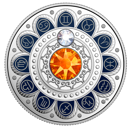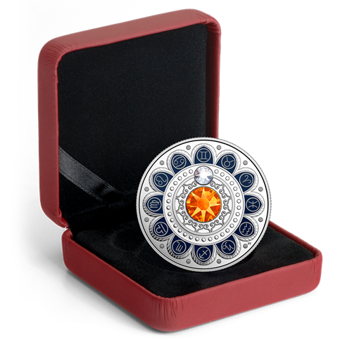 Designed by Pandora Young, your coin features an eye-catching combination of colour and engraving that resultsin a beautifully artistic rendition of the zodiac.Like the stars and planets in the sky, a clear Swarovski® crystal embellishment is in alignment with the traditional glyphof the Roman figure "II" for "2" or "twins," which is the zodiac symbol for Gemini (May 21–June 20). At the centreis a larger Swarovski® crystal embellishment; its orange colour also represents those born under the Air sign known for energy, cleverness, adaptability and wit.