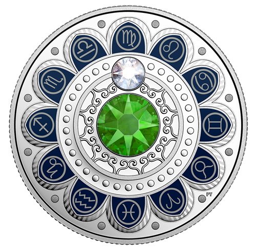 Designed by Pandora Young, your coin features an eye-catching combination of colour and engraving that results in a beautifully artistic rendition ofthe zodiac. Like the stars and planets in the sky, a clear Swarovski® crystal embellishment is in alignment with a traditional glyph of an "M" with a loop to represent chastity—the zodiac symbol for Virgo (August 23–September 22). At the centre isa larger Swarovski® crystal embellishment; its chartreuse colour also represents those born under the Earth sign known forloyalty, kindness, practicality and hard work. The obverse features the effigy of Her Majesty Queen Elizabeth II by Susanna Blunt.