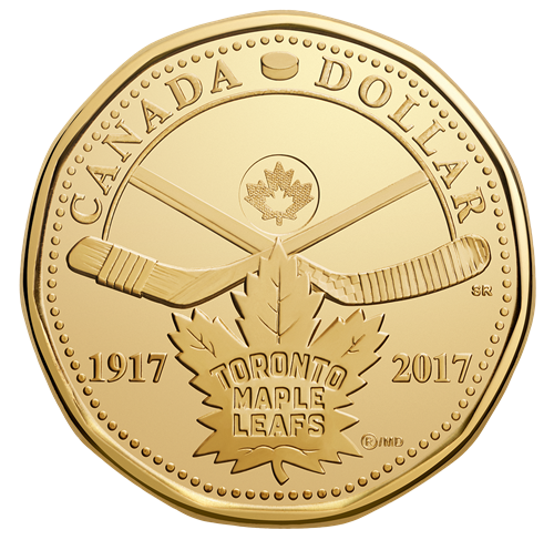 Two hockey sticks face off above the Leafs' currentmaple leaf logo in this dynamic design by Canadian artist Steven Rosati; the vintage stick to the lefthonouring the team's storied past while the stick to the right delivers an enthusiastic nod to the modern game. Our unique security feature is positioned between the two sticks like a hockey puck, andthe Leafs' current logo shines below them. It's flanked by the years "1917" and "2017" while a ring of 100 dots further highlights the team's centennial. The coin's denomination is engraved in a semi-circle at the top of the coin with a puck positioned between the words "Canada" and "Dollar."