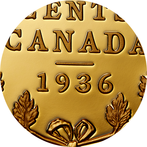 Your coin is a 99.99% pure gold reproduction of the rare 1936 Dot 10-cent coin. Its reverse features the crossed maple boughs designed by W. H. J. Blakemore and bears the original "1936" date. A dot beneath the bow is the identifying mark of coins produced with obsolete designs in early 1937 during the transition to the reign of King George VI. The obverse features the year of issue, "2021",and the historic effigy of King George V by Sir E. B. Mackennal.