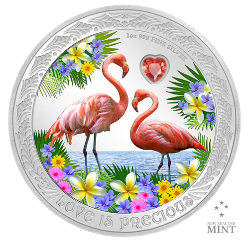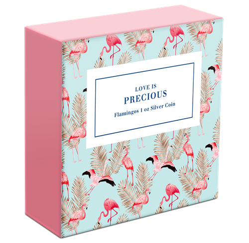 Introducing the latest coin in the annual Love is Precious Silver Coin collection featuring the wonderfully exotic Flamingo. This 1 oz. pure silver coin features the two birds surrounded by a myriad of flowers.