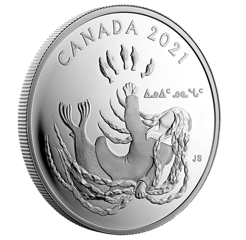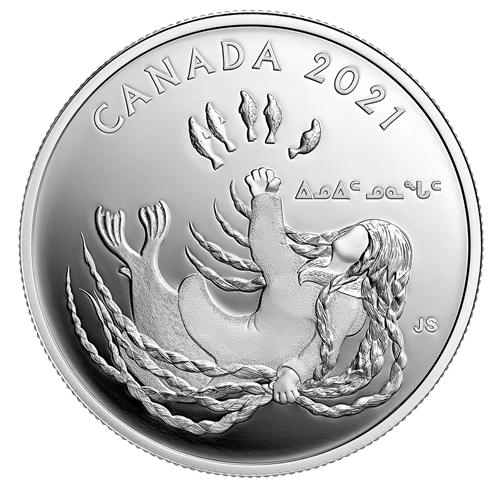 The first legend comes from the four regions of Canada that are collectively known as Inuit Nunangat, which is indicated on the coin’s reverse (“ᐃᓄᐃᑦ ᓄᓇᖓᑦ”). It is the tale of a beautiful Inuk who became the Sea Goddess and mother of all marine mammals after she was tossed into the ocean.