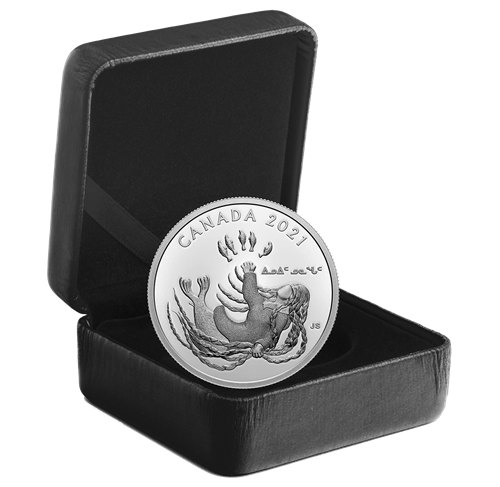 The first story comes from Inuit Nunangat, where unikkaaqtuat (“myths” in Inuktut) play an important role in the transmission of knowledge and values. Depicted on this 99.99% pure silver coin, the well‑known legend of the Sea Goddess continues to inform new generations and inspire artists such as Jason Sikoak, who designed this coin.