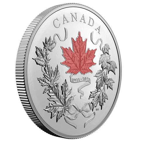 Celebrate the milestone anniversaries of two official symbols of Canada! Your coin’s reverse highlights the 100th anniversary of the national colours of Canada (1921-2021), while the maple design and obverse highlight the 25th anniversary of Canada’s arboreal emblem, the maple (Acer) tree.