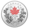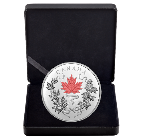Canada’s arboreal emblem consists of not one but 10 different maple (Acer) species, and that diversity is perfectly illustrated on this 10 oz. pure silver coin. Its engraved design features a clockwise swirl of Canadian maple leaves, each one different from the other and held together by a ribbon that ends in a bow. To top it off, we’ve added selective touches of red and white – Canada’s official colours since 1921 – to transform this Arboreal Anniversary piece into a dual celebration of national symbols.