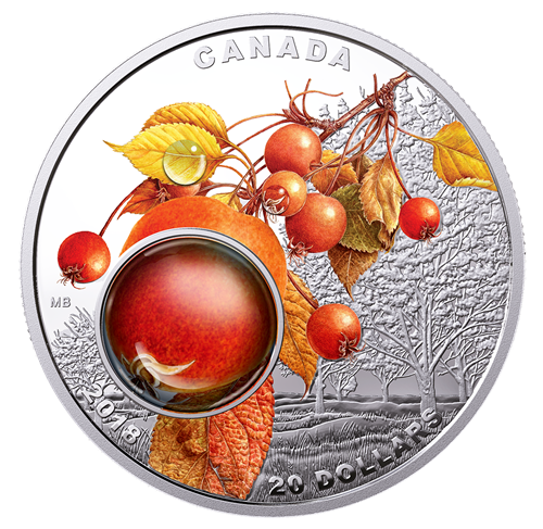 The colours of the harvest season are thefocus of this captivating design by Canadian artist Margaret Best. Exquisitely engraved in a proof finish, the scene invites the viewer to step into an orchard on an idyllic fall morning, when early sunlight streams over the horizon and illuminates the rolling landscape. Vibrant colour draws the eye towards the branch of a crab apple tree, where delicate-looking dewdrops cling to the clustered leaves and fruit. The focus is undeniably the dominant design element: a perfectly round droplet made of clear resin, which mimics the magnifying effect of a dewdrop for an enhanced view of the diminutive crab apple. The obverse features the effigy of Her Majesty QueenElizabeth II by Susanna Blunt.