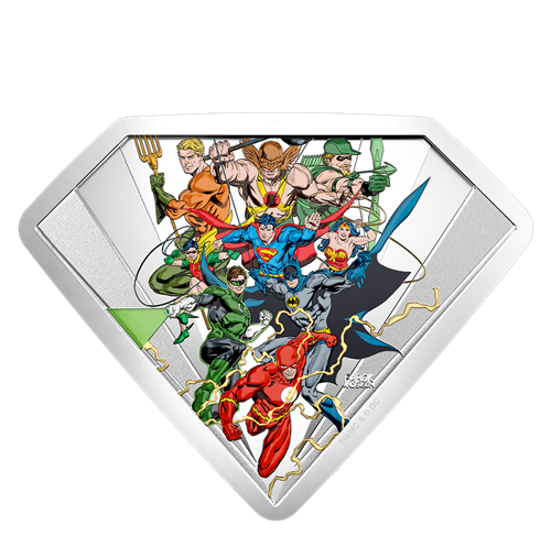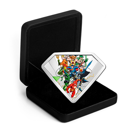Your coin is a modern-day tribute to the past and features an original concept by Canadian comic book artist Jason Fabok, with colours by Brad Anderson. Within the confines of this S-Shield coin, the members of the Justice League seem poised to make the leap from their Bronze Age adventures to this modern era. From left to right, the colourful all-starteam-up includes: Aquaman, Hawkman and Green Arrow; Robin (Dick Grayson), Superman and Wonder Woman; Green Lantern (Hal Jordan) and Batman; and finally, The Flash (Barry Allen), who leads the rush with his lightning-fast speed. The obverse features the effigy of Her Majesty Queen Elizabeth II by Susanna Blunt.