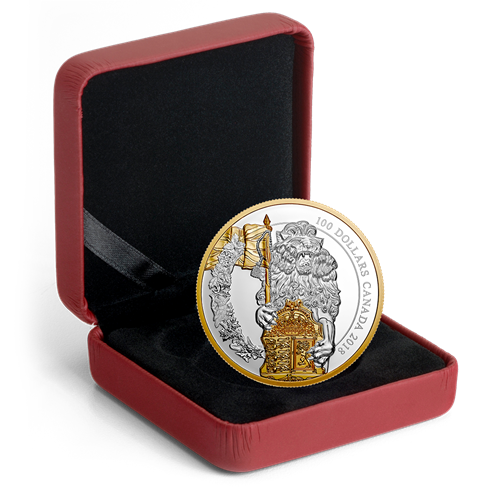 The reverse image by Canadian artist Patrick Bélanger standsbefore the ceremonial entrance on Parliament Hill, in Ottawa, Ont., where a heraldic lion supporter is carved into the west side of the sandstone-lined entryway. On the reverse, the noble animal is deliberately positioned to convey the towering height (1.8 m)of its real-life counterpart, while gold plating highlights the Union Flag and the Shield of the Royal Arms of the United Kingdom. The sculpted figure is paired with an ornamental flourish, whose floral motif is based on a frieze that also adorns the Centre Block’s grand entrance. The reverse includes the face value, “100 DOLLARS”, and the words “CANADA 2018”. The obverse features the effigy of Her Majesty Queen Elizabeth II by Susanna Blunt.