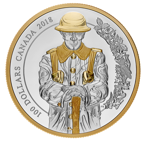 The reverse by artist Patrick Bélanger soars to great heights for a near eye-level view of the soldier that is carved at the centre of the Peace Tower on Parliament Hill, in Ottawa, Ont. The positioning of the figure helps convey the height of the actual sculpture. The soldier bears a sombre, reflective expression and stands in reverse arms pose—a common theme during the post-war period, and a fitting symbol of remembrance for Canada’s fallen soldiers. Gold plating selectively highlights the soldier’s lapel, buttons and gear, including therifle that is kept pointed down to the ground. To the right of the remembrance-themed sculpture is an ornamental flourish, whose floral motif is based on afrieze that adorns the Centre Block’s grand entrance. The reverse includes the face value, “100 DOLLARS”, and the words “CANADA 2018”. The obverse features amaple leaf background pattern and the effigy of HerMajesty Queen Elizabeth II by Susanna Blunt.
