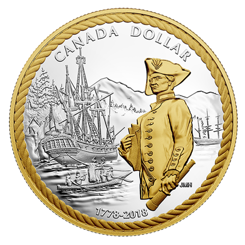 On your proof dollar, Maritime artist John Horton presents an artistic rendering of Captain James Cook's arrival at Nootka Sound in April 1778. Toweringmountains and the timbered headland of Bligh Islandprovide a stunning backdrop to this historical portrait, all precisely engraved in a superb proof finish and framed by a nautical twisted rope. Viewed in three-quarter profile, a stern-looking Cook keeps a watchful eye on his ship and crew while holding a telescope in one hand, his Admiralty orders in the other. Behind his left shoulder is HMS Discovery, which is moored a short distance awayfrom HMS Resolution , whose crew is unrigging the ship and removing masts and spars in preparation for repairs. In the water, a group of Nuu-chah-nulth approach the Resolution in a canoe, ready to extend a friendly greeting. The obverse features the effigy of Her Majesty Queen Elizabeth II by Susanna Blunt.