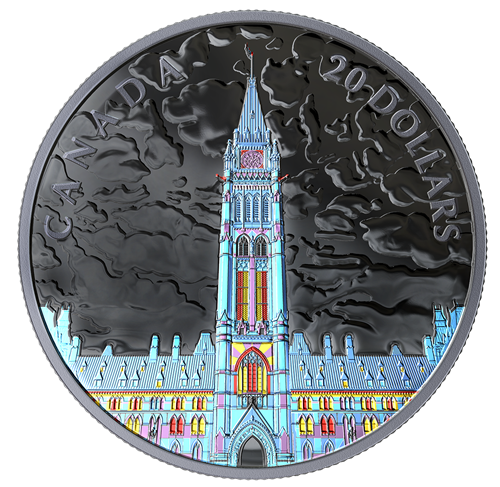 Northern Lights on Parliament Hill is a magical sound and light show that attracts over 200,000 spectators in Ottawa each year. The imagery projected onto the Peace Tower in Ottawa is adream-like voyage through the wonders of Canadian culture and history that you’ll want to keep with you. The Royal Canadian Mint has created a coin to eternalize this enchanted moment. The designfeatures the unique Colour Reveal technology a Royal Canadian Mint first!