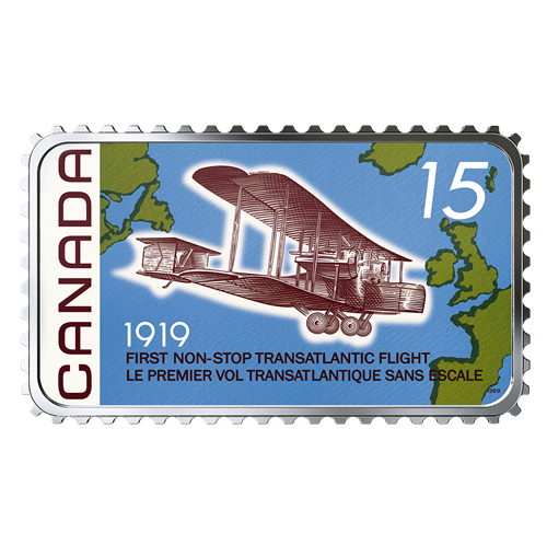 On June 14, 1919, a modified First World War Vickers Vimy bomber lifted off from St. John’s, Newfoundland and flew straight into the history books.British aviators John Alcock and Arthur Whitten Brown persevered through a rough takeoff, equipment failures, fog, ice and snow before crash-landing the next day in County Galway, Ireland. In doing so, they became the first aviators to cross the Atlantic Ocean in less than 72 consecutive hours—a new milestone in aviation history. In 1969, Canada Post issued a 15-cent stamp to commemorate the 50th anniversary of the first non-stop transatlantic flight. Now, 50 years after that special issue—and on the centennial ofthis aviation first—the Canadian stamp is forever immortalized on this stamp-shaped, 99.99% fine silvercoin.