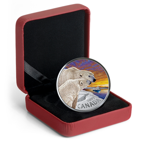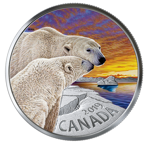 The reverse design by wildlife artist W. Allan Hancock captures a tender moment between two polarbears (Ursus maritimus). One polar bear nuzzles the other in a gesture that expresses affection and highlights the social bond betweenthe pair. A balanced mix of colour and engraving brings the Arctic landscape to life, helped by variousfrostings that separate the mountains from the sea ice. In the sky, a colourful sunset is reflected on the open water below, where an iceberg adds a cool turquoise hue. The reverse includes the year “2019” and the word “CANADA”, both struck incuse. The obverse features the effigy of Her Majesty Queen Elizabeth II by Susanna Blunt.