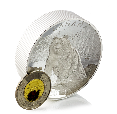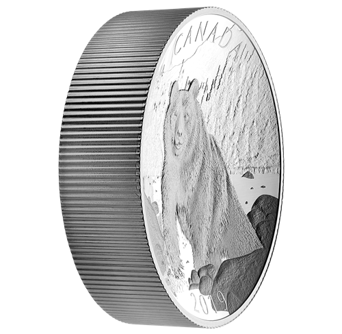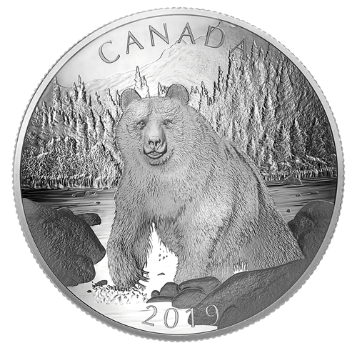 Your concave-shaped coin provides a unique canvas for this wildlife portrait by Denis Mayer Jr. Seen in three-quarter view, a brown bear (Ursus arctos) splashes its way across a salmon-rich river in Western Canada. Against a mountain backdrop, the bear seemingly pauses mid-step to gaze at the viewer. Various finishes add depth to the inward-curving design, which also includes the word “CANADA”, the year “2019” and the face value of “100 DOLLARS”. The equally concave-shaped obverse features a concentric pattern of maple leaves and the effigy of Her Majesty Queen Elizabeth II by Susanna Blunt.