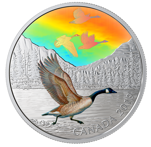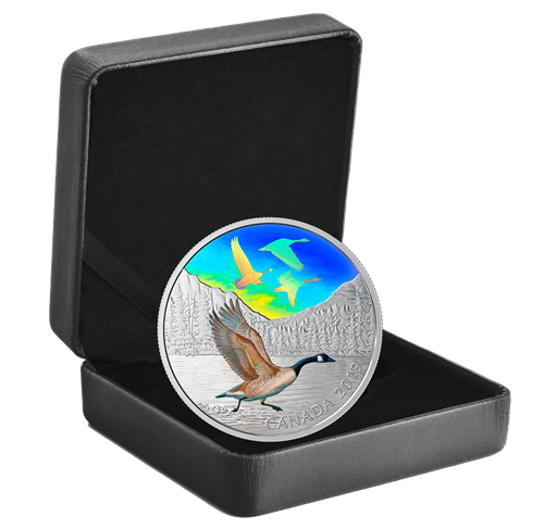 Designed by Pierre Leduc, your 2 oz. pure silver coin steps into the Canadian wilderness, where mountain peaks and evergreens add a soaring sense of majesty tothe engraved lake setting. In the foreground, a selectively coloured Canada goose is depicted just before lift off: its black head is thrust forward as it rushes headlong into the direction of its intended flight, with wings spread wide to gain momentum in order to join the others in the sky. The three flying geese are depicted in a multi-frame hologram, which re-creates the powerful wingbeats and fluid flight movements that carry them across Canada’s skies. The reverse also includes the word “CANADA” and the year “2019”. The obverse features the effigy of Her Majesty Queen Elizabeth II by Susanna Blunt.