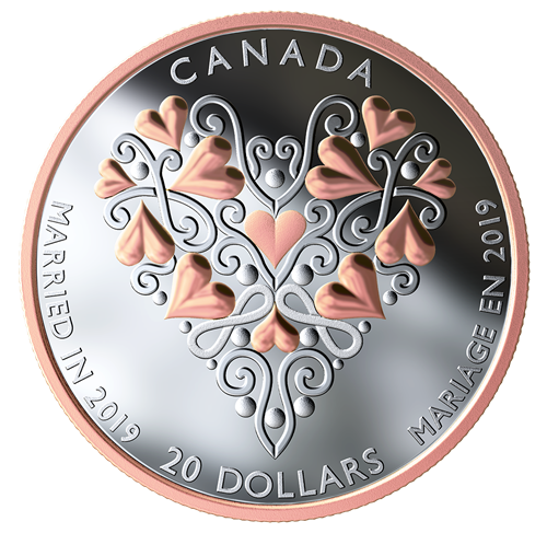 Designed by Canadian artist Sylvie Daigneault, your coin is a beautiful celebration of love and an artistic ode to marriage–an occasion when two individuals marktheir commitment to one another. Fittingly, two different design elements—hearts and arabesque-style scrolls—come together in one intricately engraved pattern that forms a large heart shape. Also engraved onthe reverse is the year “2019”,the word “CANADA” and the face value “20 DOLLARS”. The obverse features a pink gold-plated effigy of Her Majesty Queen Elizabeth II by Susanna Blunt.