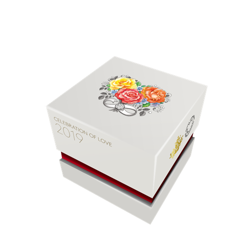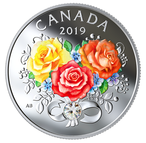 Designed by Anna Bucciarelli, your coin features a bouquet of roses that form a blooming heart. Each flower is selectively coloured to represent different expressions of love: yellow for friendship and gratitude; red for romance and passion; and orangefor excitement and enthusiasm. Blue accent flowers add a balancing touch of tranquility to the arrangement. Shaped like the infinity symbol, the ribbon symbolizes eternal love and is adorned with a Swarovski® crystal.