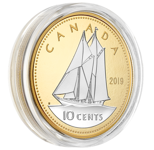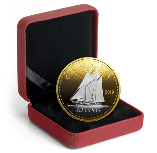 The reverse features Canadian artist Emanuel Hahn’s iconic image of a stylized schooner with tall sails flying as it sails the open sea. Reverse gold plating fills the field while the coin’s silver surface draws the eye to the engraved relief, which includes the word “CANADA”, the date “2019” and the face value of “10 CENTS”. The reverse gold-plated obverse features the effigy of Her MajestyQueen Elizabeth II by Susanna Blunt.