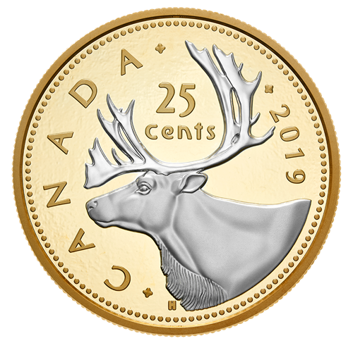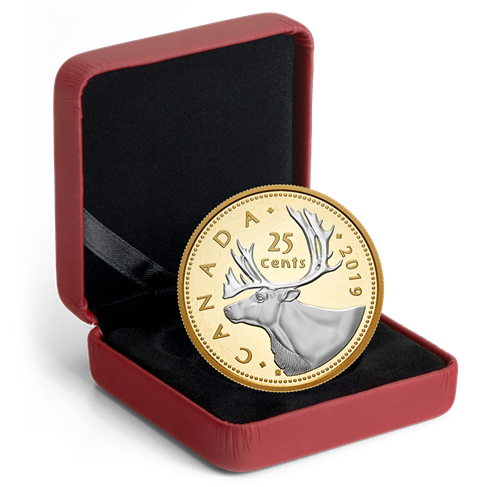 The reverse features Canadian artist Emanuel Hahn’s iconic left-side profile of a caribou with majestic antlers. Reverse gold plating fills the field while the coin’s silver surface draws the eye to the engraved relief, which includesthe word “CANADA”, the face value “25 CENTS” and the date “2019”. The reverse gold-plated obverse features the effigy of Her Majesty Queen Elizabeth II by Susanna Blunt.