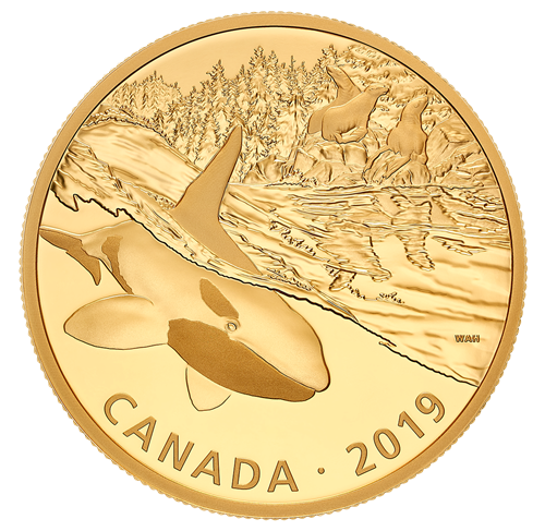 Featuring the mastery of Canadian wildlife artist W. Allan Hancock, the first coin in the series is a fully gold-plated pure silver coin that is a work of art. The dynamic composition is rich in depth and contrast. A massive orca occupies the foreground as it cuts through the beautifully rendered waves. Striking as it is, the orca is a vicious hunter, and its hunger is a force to be reckoned with. Upon the rocks behind sit his prey, three sea lions. The background fades into aforest, and the gazing sea lions remain unaware of the danger lurking beneath the water. The obverse features the effigy of Her Majesty Queen Elizabeth II by Susanna Blunt.