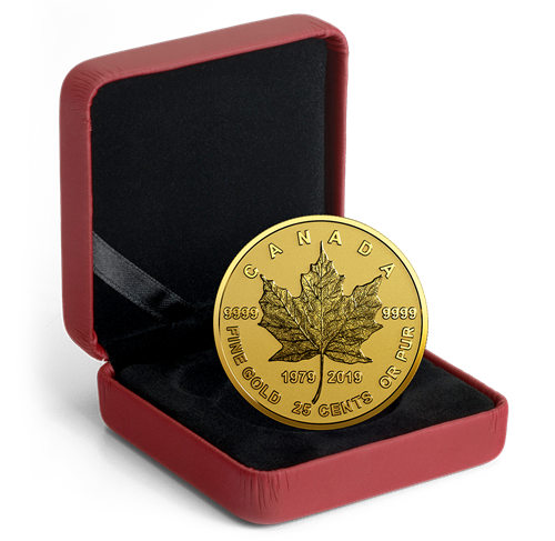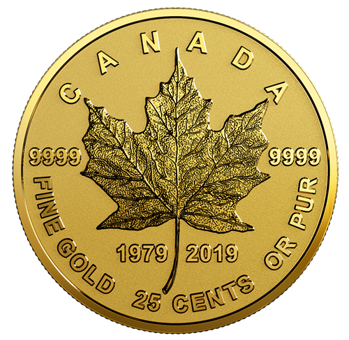 The reverse design features Walter Ott's iconic maple leaf design from the original Gold Maple Leaf bullion coin released in 1979. The realistic sugar maple leaf is intricately engraved to capture all the fine details at such a small size. The reverse features the words “CANADA” and “FINE GOLD 25 CENTS OR PUR” as well as the purity standard of “9999” and the double date of “1979-2019” The obverse features the effigy of Her Majesty Queen Elizabeth II by Susanna Blunt.