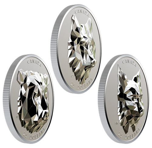 The reverse sculpture by Claude Thivierge features amultifaceted wolf head built out of 435 polygons. The three-dimensional form protrudes from the flat coin, invoking both nature and geometry in its execution. The EHR plays an integral part of the design, introducing the coin as the first of its kind in the world - sharp, brilliant and doing away with the conventional flatness of minting. The obverse features the effigy of Her Majesty Queen Elizabeth II by Susanna Blunt.