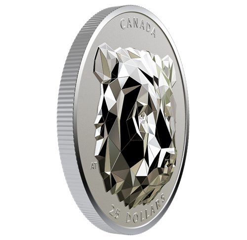 The reverse sculpture by Alex Tirabasso features a multifaceted grizzly bear head built out of 498 polygons. The obverse features the effigy of Her Majesty Queen Elizabeth II by Susanna Blunt.