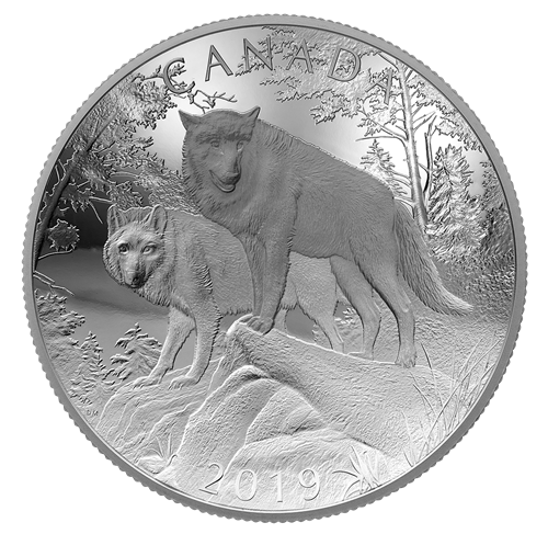 The second in your 2-coin subscription, this concave-shaped coin provides a uniquely shaped canvas for this wildlife portrait by artist Denis Mayer Jr.In a Canadian forest, two wolves (Canis lupus) pause at the edge of a cliff that gives them a commanding view of their territory. One wolf keeps a watchful eye on what lies below while the other has turned its head to face the viewer, bringing its facial features into full view. The finelyengraved forest setting is enhanced with various finishes that add a sense of depth to the inward-curving design, which also includes the word “CANADA”, the year “2019” and the face value “100 DOLLARS”. The equally concave-shaped obverse features a concentric pattern of maple leaves and the effigy of Her Majesty Queen Elizabeth II by Susanna Blunt.