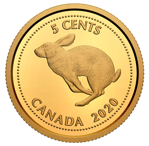 The reverse re-creates Canada's 1967 Centennial five-cent coin design by artist Alex Colville and features a profile view of a hopping rabbit. The reverse also features the engraved face value "5 CENTS", the word "CANADA" and the date "2020". The obverse features Canada's second effigy (1965-1989) of Her Majesty Queen Elizabeth II by Arnold Machin.