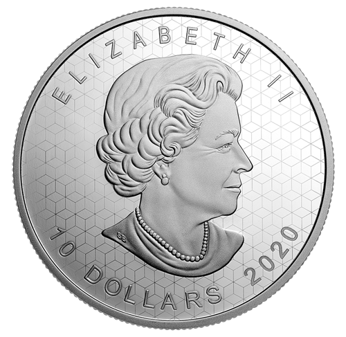 The reverse image features the Silver Maple Leaf design from the Royal Canadian Mint’s bullion coinage, rendered using newly developed technology developed in collaboration with the Centre for Research in Photonics at the University of Ottawa. The reverse and obverse field pattern reproduces an expanded, non-pulsating version of the pulsating patternon the maple leaf. The obverse features the effigy of Her Majesty Queen Elizabeth II by Susanna Blunt.