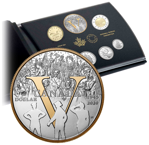 Our 2020 75th Anniversary of Victory in Europe (V-E) Day collection is the multi-part story of Canada in 1945—a story of wartime contributions and a peacetime legacy. Every coin in our 2020 V-E Day collection—including this set’s gold-plated version of the 2020 Proof Dollar—features a special Victory privy mark.