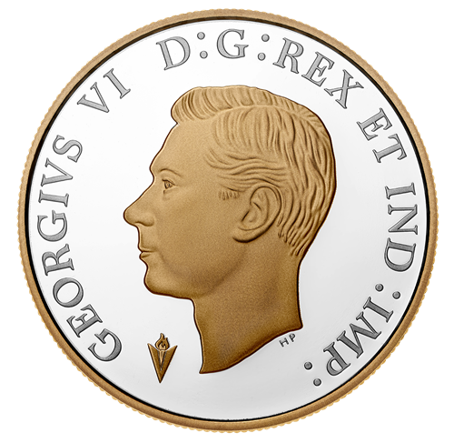 A selectively gold-plated “V” for Victory dominates the reverse design by artist Pandora Young. The crowd represents jubilation on the home front on May 8, 1945, a day when Canadians poured into streets and public places to celebrate Victory in Europe (V-E) Day. The spontaneous celebration gradually fades behind the “V” to become a scene of remembrance, with three silhouettes representing the different branches (navy, armyand air force) of the Canadian and British Armed Forces in which Canadians and Newfoundlanders served. The obverse features the effigy of King George VI byT. H. Paget and a Victory privy mark.