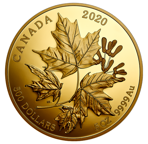 The reverse design by artist Nathalie Lagacé is a botanical work of art that captures the natural beauty of Canada's beloved maple leaf. It features four different sizes of sugar maple (Acer saccharum) leaves arranged on opposite sides along the twig and clusters of winged samaras or keys. The reverse includes the text "CANADA", the year "2020", the face value of "500 DOLLARS", the nominal metal weight "5 OZ" and the purity standard of "9999 AU". The obverse features the effigy of Her Majesty Queen Elizabeth II by Susanna Blunt.