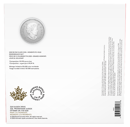 "From 1939 to 1945, more than 1,000,000Canadians and Newfoundlanders put their lives on hold to serve in uniform – and more than 45,000 of our brave men and women never came back. Now, 75 years since the end of the Second World War, we continue to remember the sacrifices of the brave soldiers, sailors and airmen who risked their lives,and those who lost them, for the freedom of others. The Royal Canadian Mint's new 2020 Remembrance Day coin helps us all commemorate the service of our Veterans, military service members, and the Royal Canadian Mounted Police."