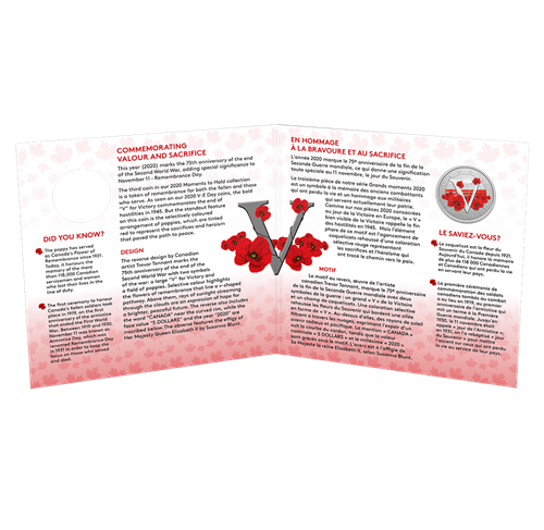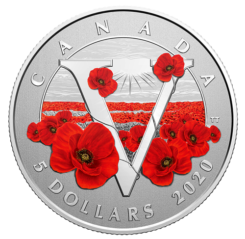 The reverse design by Canadian artist Trevor Tennant marks the 75th anniversary of the end of the Second World War with two symbols of the war: a large "V" for Victory and a field of poppies. Selective colour highlights the flowers of remembrance that line a v-shaped pathway. Above them, rays of sunlight streaming through the clouds are an expression of hope for a brighter, peaceful future. The reverse also includes the word "CANADA" near the curved rim, whilethe face value "5 DOLLARS" and the year "2020" are inscribed below. The obverse features the effigy of Her Majesty Queen Elizabeth IIby Susanna Blunt.