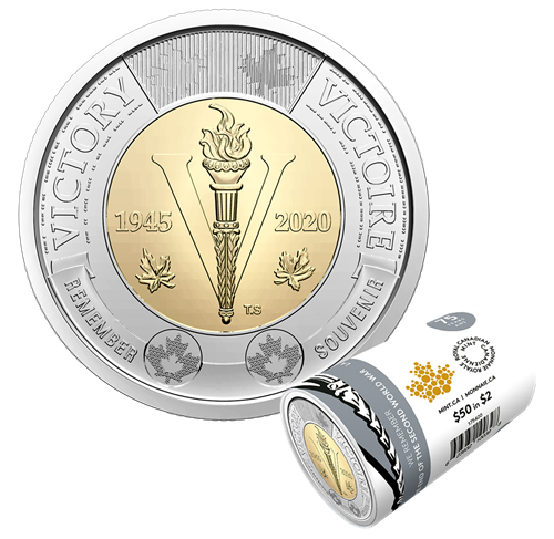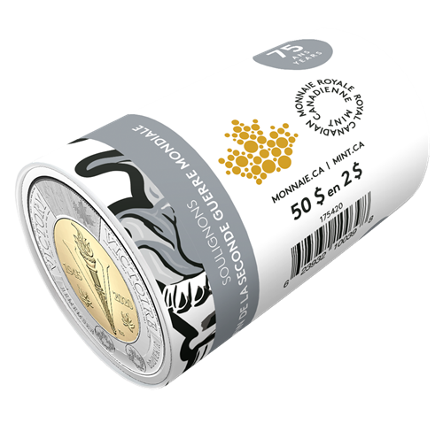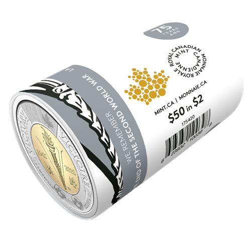 The 2020 75th Anniversary of the End of the Second World War $2 commemorative circulation coin places a piece of our history in your pocket change… but a Special Wrap Roll instantly adds 25 of them to your collection.