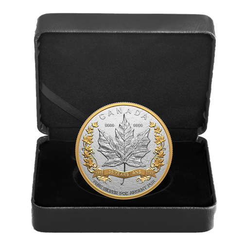This 5 oz.-sized 35th anniversary celebration embodies the same qualities that continue to define the SML: beauty, purity and classic craftsmanship. On both the obverse and reverse, selective gold plating adds a rich, golden gleam that reflects our pride in the SML, whose namesake leaf continues to captivate collectors and investors worldwide.