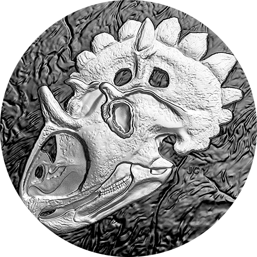Beneath the rhodium plating on your coin’s reverse, the engraved texture represents the thrill of discovery: it mimics the textured appearance of hard rock in which the Regaliceratops skull was encased.