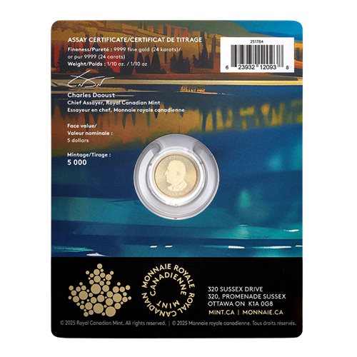 Price is subject to change without notice. Represents minimum guaranteed weight. The Royal Canadian Mint reserves the right to refuse or limit orders, and to change its prices and product offerings without notice if, for any reason, it should be found necessary to do so. The Mint also reserves the right to impose purchase quantity limits on certain items. Once an order is placed, it cannot be cancelled. Premium Bullion Products in special packaging are final sale (they cannot be returned or exchanged and are not eligible for refund for any reason). Exceptionally, in the event of a damaged, defective or incorrect product purchased through the Mint online (whether by mobile app or on mint.ca) or via the call centre, you may contact the Mint’s Customer Service Solutions Centre within 14 calendar days after shipment to request an exchange for the same product originally purchased (subject to product availability), where the Mint will, at its discretion, evaluate exchange requests on a case-by-case basis.