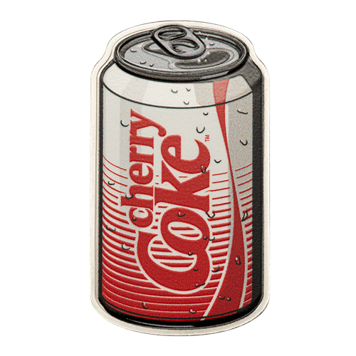 - The coin design features the colorized shaped design of a retro Coca-Cola Cherry can with red and white stripes.