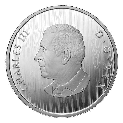 Backed by a woodgrain pattern, the reverse design by Cathy Bursey-Sabourin features a lion depicted in a heraldically stylized manner within a cartouche frame. The lion is presented in a forward-facing pose and engraved in Extraordinarily High Relief (EHR). The surrounding wreath is engraved in Ultra High Relief (UHR) and consists of floral emblems from the Arms of Canada—the Tudor rose of England, the thistle of Scotland, the shamrock of Ireland, the lily of France, and Canada’s maple leaf—along with seed pods, flower buds and maple keys signifying renewal and hope for the future. The woodgrain pattern also appears on the obverse, which features the effigy of His Majesty King Charles III by Canadian artist Steven Rosati.