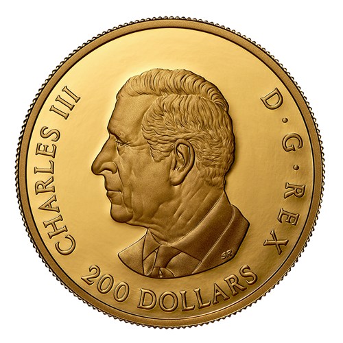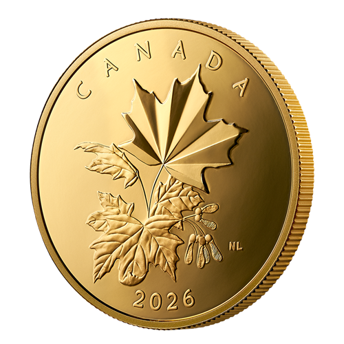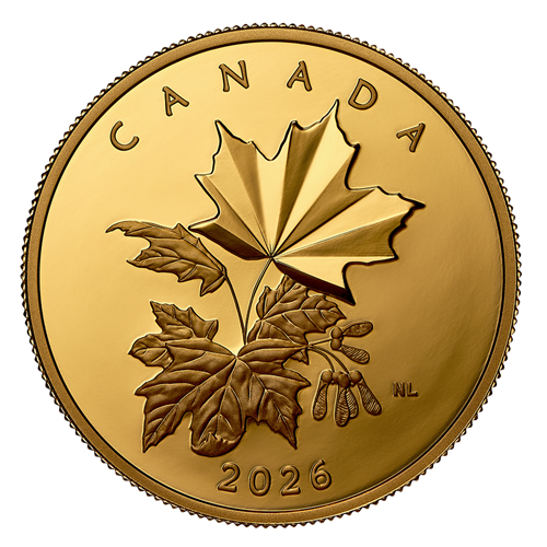 The reverse design by Canadian artist Nathalie Lagacé features a cluster of sugar maple (Acer saccharum) leaves and samaras rendered in a classic, botanical art style. The uppermost leaf is brought to life by multifaceted technology, with long angled facets radiating from the base of the leaf to give it a more luminous, dimensional shape. The obverse features the effigy of His Majesty King Charles III by Canadian artist Steven Rosati.