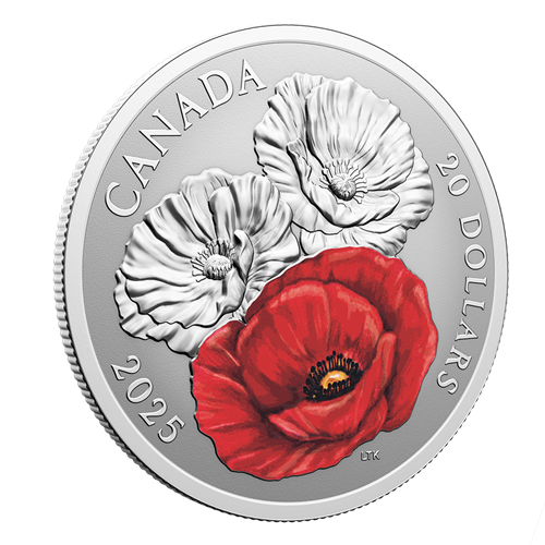 The red poppy carries a deep and powerful meaning that inspires reverence and gratitude—it is the embodiment of our everlasting esteem for those who died in defence of freedom. The 2025 Remembrance Day coin honours them through its reverse design, which features a realistic rendering of poppies—including one bright-red standout—resembling those that inspired the immortal poem of Remembrance, In Flanders Fields, written by Canadian John McCrae 110 years ago.
