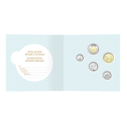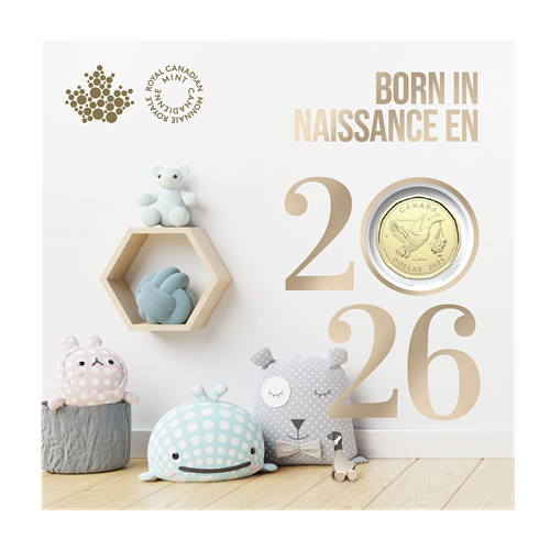 Share your love and best wishes for a future filled with happiness. A thoughtful way to celebrate baby’s arrival, this gift-and-card combo adds a distinctly Canadian touch to commemorating this joyful milestone in 2026. While all five coins serve as a lasting reminder of baby’s birth year, the set-exclusive $1 coin marks the moment by replacing the classic image of a baby-delivering stork with that of a Canada goose and gosling. The greeting card includes space to capture birth details and leave a personal message, making it a cherished memory for years to come.