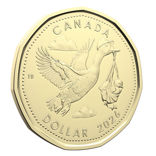 Designed by Canadian artist Tony Bianco, the $1 coin in the 2026 Baby Gift Card Set puts a Canadian spin on the classic image of a baby-delivering stork, by featuring a Canada goose and gosling instead. The obverse features the effigy of His Majesty King Charles III by Canadian artist Steven Rosati.